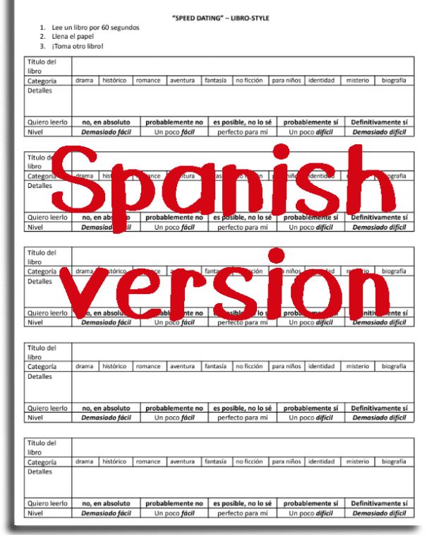 The parameters I set were 1) it was quiet, just like during FVR time and 2) they had to read (or write) the whole time. If a kid here and there stared into space, I gently redirected them. I stopped them after 6 (we did 10 books total) and noted that in the “details/detalles” section, they didn’t have to write the plot necessarily, just things they noted and thought were interesting. At the end, I encouraged them to chat with a friend about their favorite book they found today. I had them pass me their sheets so I could see what they liked. I was surprised how few were interested in the drama/historical ones and how many were all about the adventure and mystery/scary ones. This was good information for me in looking for future books! I gave their sheets back so they can use them for FVR in the future!