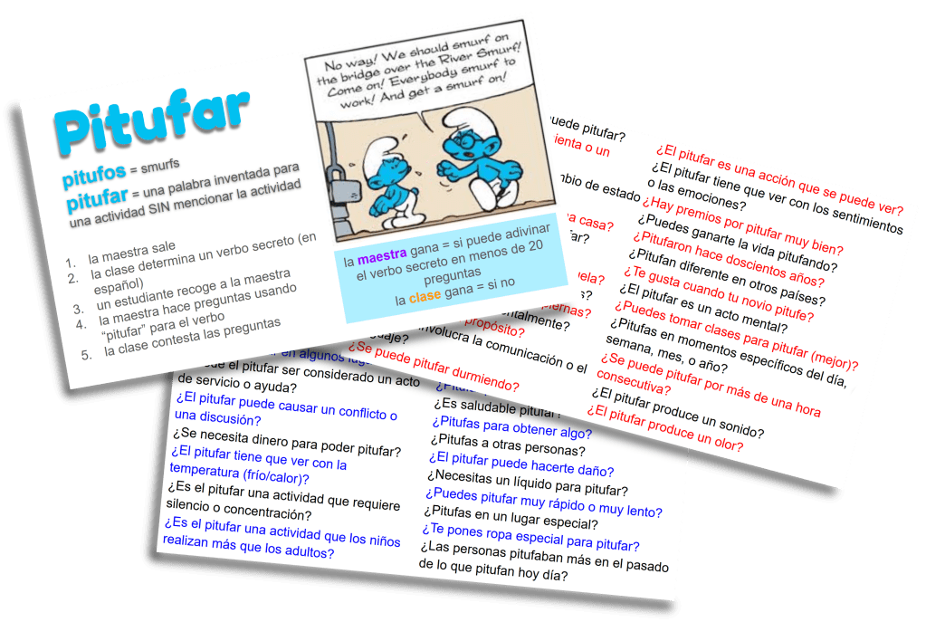 STEP 2: Someone goes and brings the guesser back in, who proceeds to question the class to try to figure out the verb. As they are questioning the class, they insert the verb “pitufar” in place of the verb.